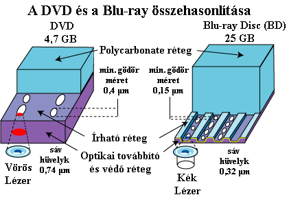 A lemezek a digitálisan kódolt videó és audió információt „gödrök”-ben tárolja. Ezek a gödrök („pits”) a lemezen spirálisan helyezkednek el a központból kiindulva a szélek felé. A lézer a gödrök másik oldalát olvassa, – azaz a dudorokat („bumps”), – hogy lejátssza a filmet, vagy a programokat, amit a lemezen tárolunk. Minél több adatot tárolunk a lemezen, annál kisebb és egymáshoz közelebb pakolt gödröknek kell lenniük. Minél kisebb a gödröcske (és ez által a dudor is), annál pontosabbnak kell lennie a lézerolvasónak.
