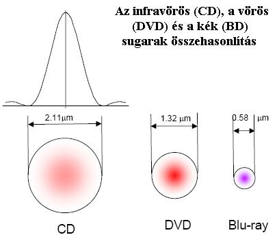 A kisebb fénynyalábbal pontosabban lehet fókuszálni, lehetővé téve, hogy olyan kis gödröcskéből („pits”) is kiolvassunk adatokat, amik csak 0,15 mikrométer hosszúak – ez kevesebb, mint fele a DVD-n található kis gödrök méretének. Mindezen túl a Blu-ray lecsökkentette a sávok szélességét 0,74 mikrométerről 0,32 mikrométerre. A kisebb gödröcskék, a kisebb fénysugár, és a rövidebb sáv-hüvelyk együttesen azt eredményezte, hogy az egyrétegű Blu-ray lemezen több mint 25 GB információt tudunk tárolni – kb. ötször annyi információ, mint amennyit egy DVD képes tárolni; egy dupla rétegű Blu-ray lemezen, pedig mintegy 50 GB-nyi adat tárolható.